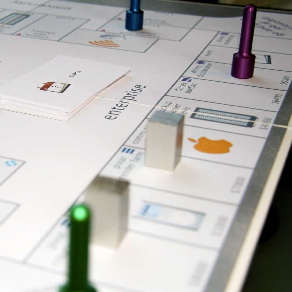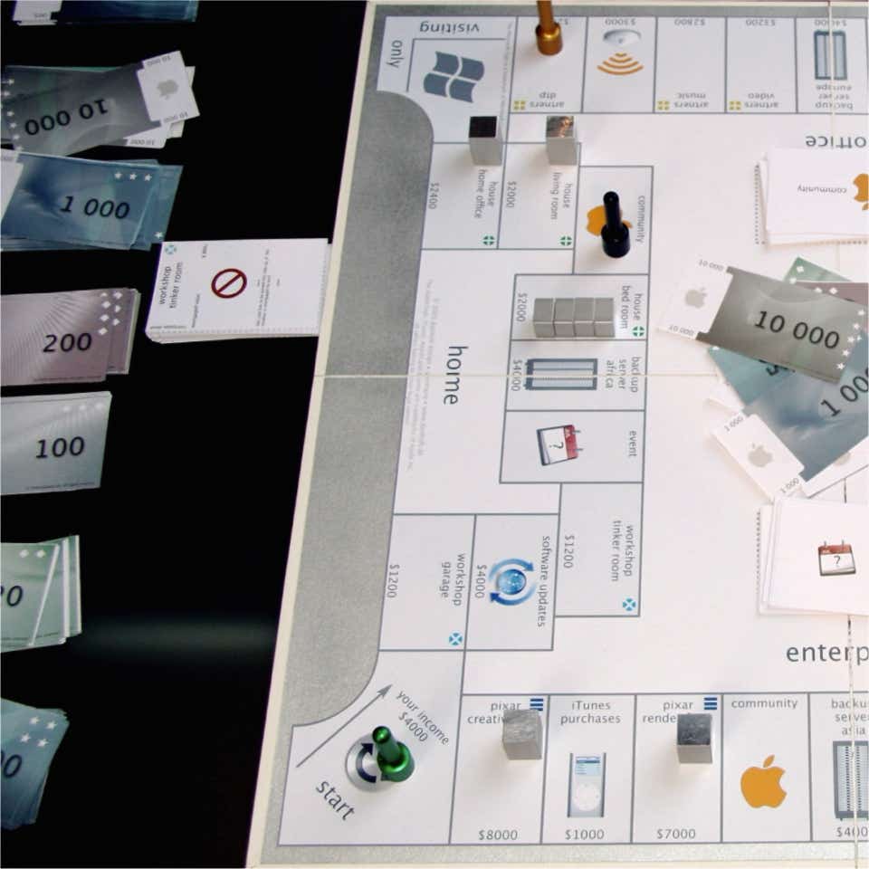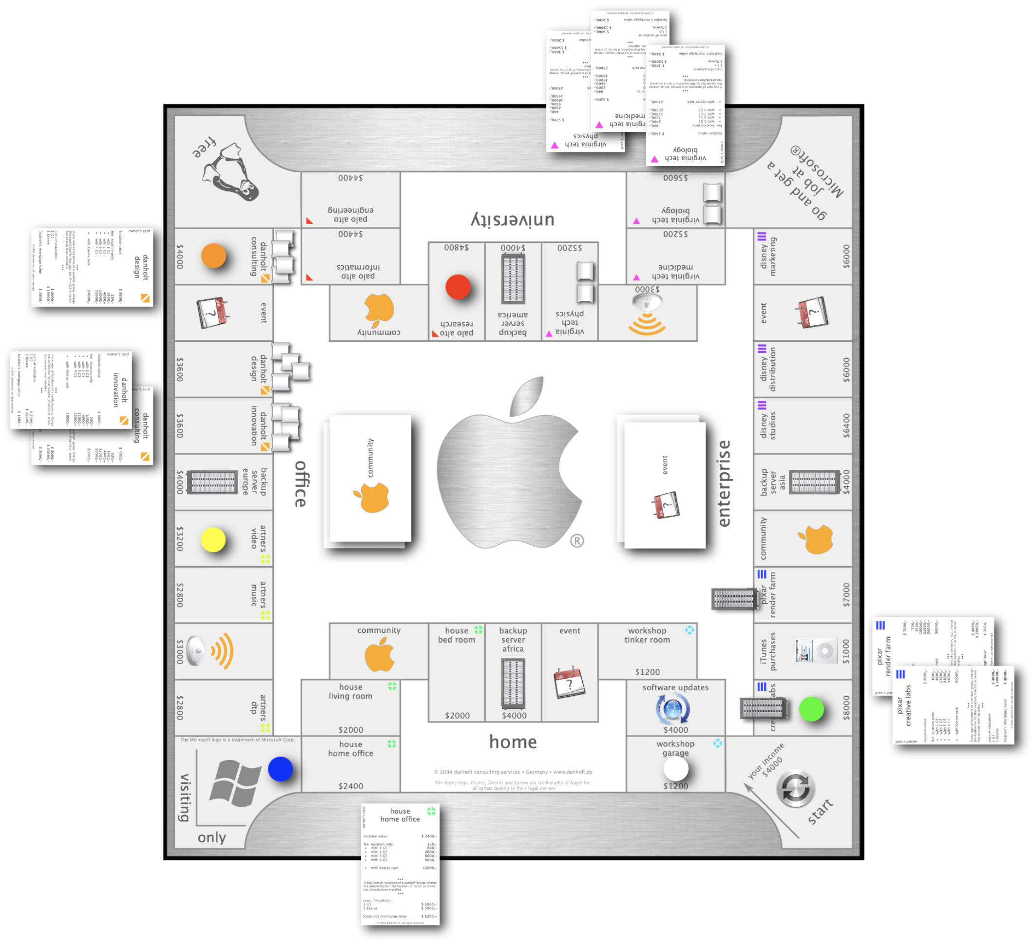 Zum 20. Jahrestag des ersten Apple MacIntosh Computers habe ich ein Brettspiel rund um Apple und Apple Produkte entworfen. Das ursprünglich in Aluminium gefertigte Spielbrett wurde im Laufe des Jahres 2006 modifiziert. Eine zusammenklappbare Version aus Hartpappe mit Metall-Anmutung wurde entworfen.