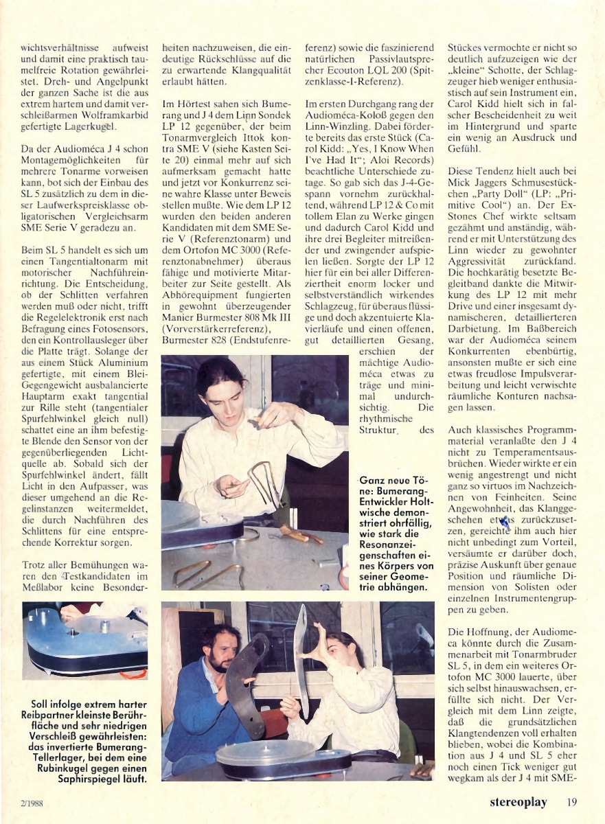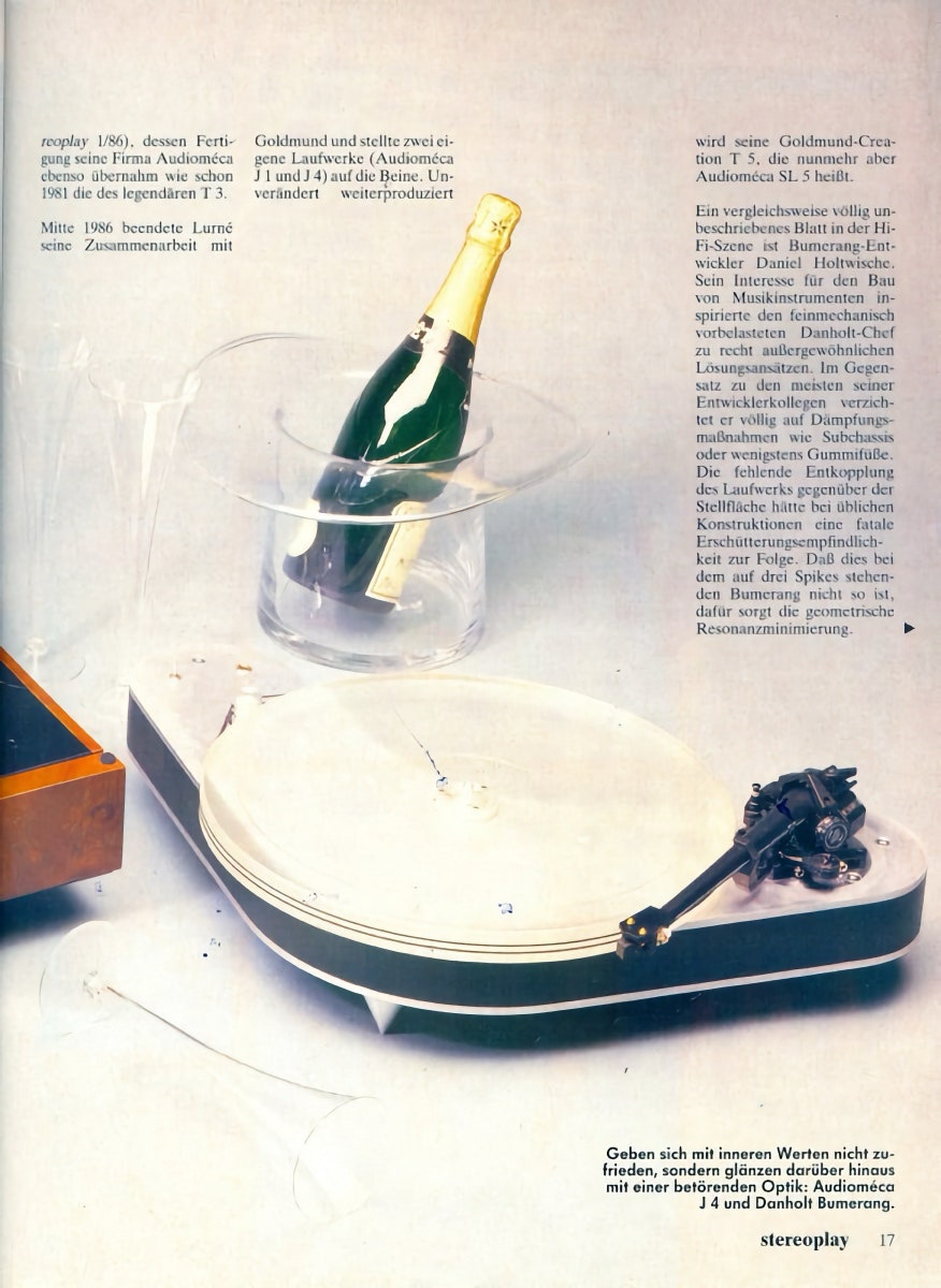 Der danholt-Bumerang hingegen ist weitestgehend ungedämpft. Er ist über drei konische Metallkegel unmittelbar mit dem jeweiligen Untergrund gekoppelt. Alleine seine Bumerang-förmige Geometrie in Kombination mit einem Sandwich aus 2 Metallplatten und einem massiven Holzfaserkern sowie die drei kegelförmigen, aus dem vollen Metall gefertigten Füße, bilden einen nahezu resonanzfreien Korpus. Diese Geometrie sorgt zudem für einen optimalen Schwerpunkt sowie Trägheitsmomente bei äußerer Anregung. So kann dieser Plattenspieler z.B. auch während des Abspielvorgangs von einer Person sanft angehoben und bewegt werden, ohne dass die Abtastnadel aus der Plattenrille springt. Die Realisierung einer ungedämpften Konstruktion, jedoch ohne störende Resonanzen, wie dies beim danholt Bumerang verwirklicht wurde, sorgt für geringeren Energieverlust, wodurch Musik dynamischer und kraftvoller klingt.