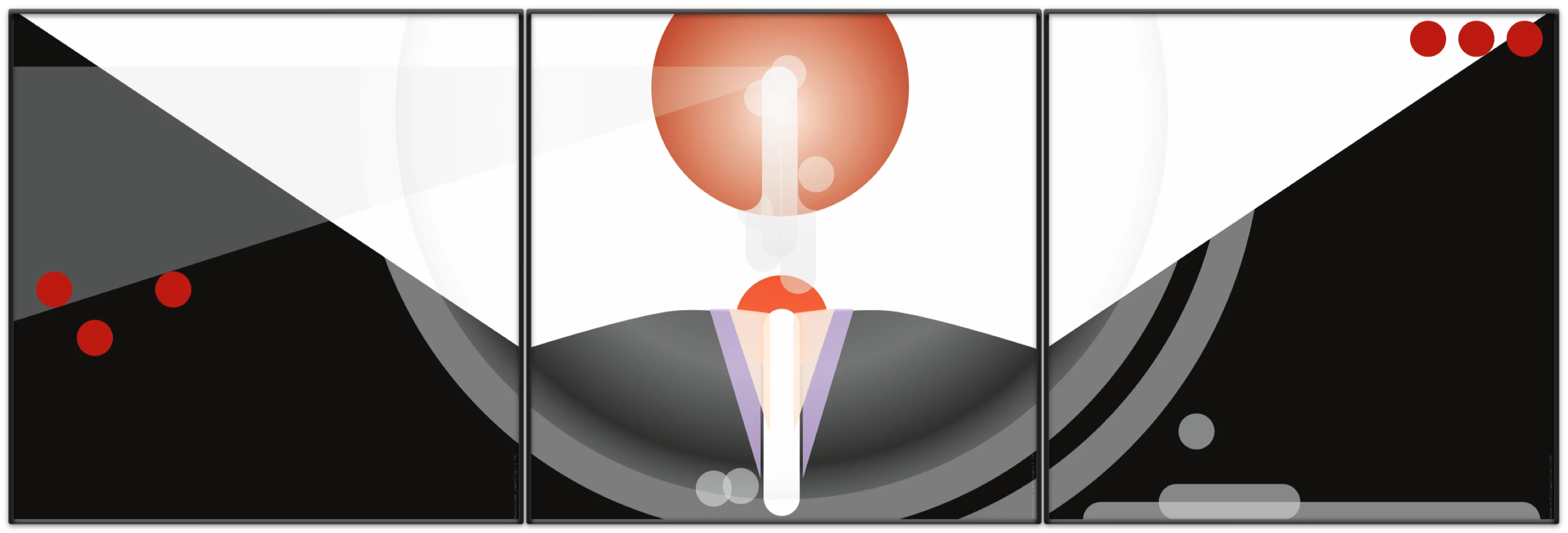 Linkes und rechtes Panel bieten eine gewisse Symmetrie und Kontinuität durch die jeweils drei roten Kreise. Sie scheinen auf repetitive Muster zu deuten.