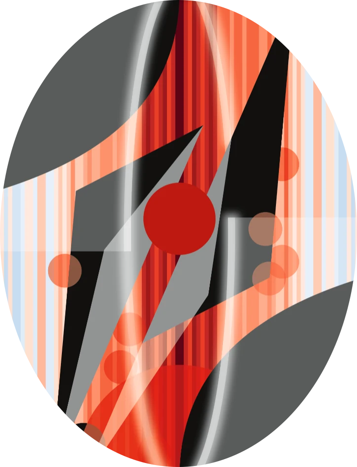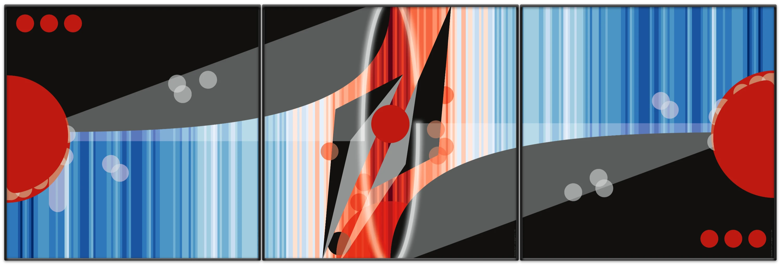 Die Klimastreifen im Hintergrund, die das Werk zwar augenscheinlich mit der aktuellen Klimakatastrophe verknüpfen zu scheinen deuten aber gleichzeitig auch auf das soziale und politische Klima der Gegenwart hin und darüberhinaus ganz besonders auf die Traumata und Irrationalität unserer menschlichen Psyche. Die Streifen zerschneiden die Fläche, spiegeln sich um die Bildmitte und verdeutlichen, dass die Zerstörung und Erhitzung global sind – ein Kontinuum, das aus den Fugen geraten ist. Dieses Spiegelmotiv ist aber auch Warnung: Was der Mensch der Erde, den Mitmenschen und sich selbst antut, wird unweigerlich auf ihn selbst zurückfallen. Der ganze Prozess ist an der senkrechten Mittelachse gespiegelt dargestellt – ein klarer Fingerzeig, dass ganz gleichgültig welche Art von Ereignis uns den Wendepunkt überschreiten lässt, eine mindestens ebenso lange Zeit der Genesung vor uns liegen wird.