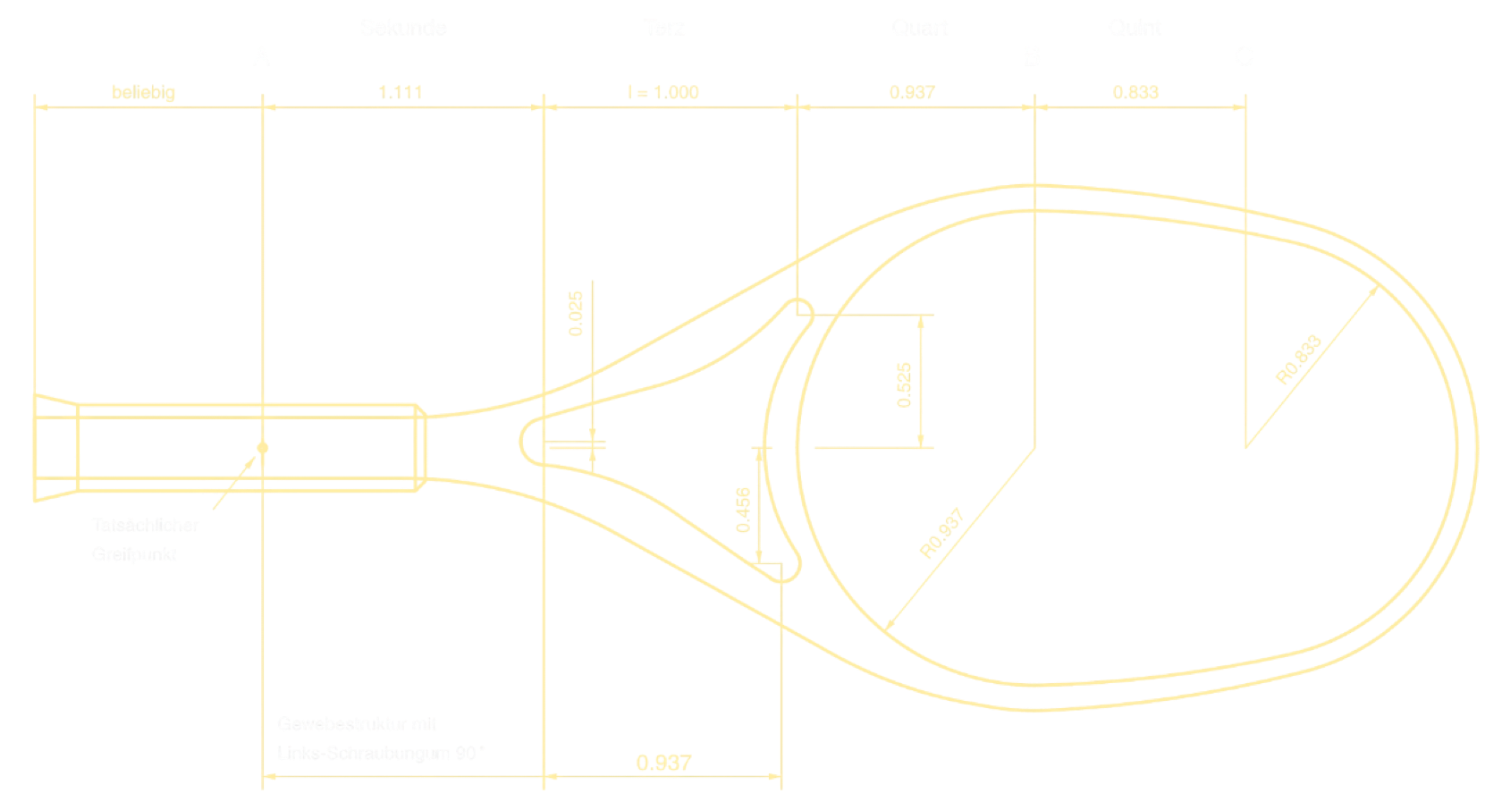 Vom Schlägerherz ausgehend und dieses als Einheitsmaß gleich „1“ setzend, wird die Proportion bis zum Griff- bzw. Greigpunkt als Sekunden-Intervall definiert, wohingegen der sog. „Sweet Spot“ im Bereich zwischen Quart- und Quint-Proportionen liegt.