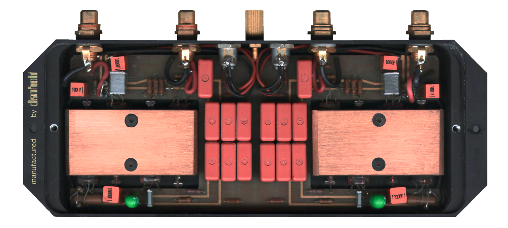 Für linken und rechten Stero-Kanal getrennt, wurden massive Kupferblöcke mit passgenauen Bohrungen für die Verstärkerröhren konstruiert und gefertigt. Spezielle Dämpfungselemente aus Karbonfasern zur thermischen und mechanischen Stabilisierung wurden dabei zwischen Kupferblock und den Glaskolben der Röhren eingesetzt.